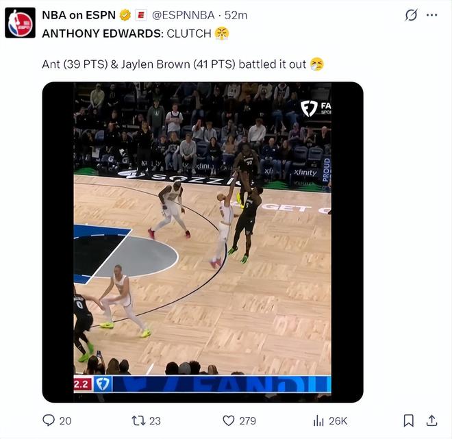 终场前14秒爱德华兹面对 怀特险些被抢断,他从地上捡起球后直接后仰三分出手命中,这一球后森林狼领先到6分锁定胜局,进入最后44秒爱德华兹两个罚球+1个三分帮助球队拿到胜利。