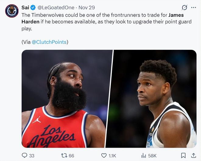 一天之前,美媒Clutchpoints报道,如果快船愿意交易詹姆斯-哈登,那么森林狼会成为追逐哈登的球队之一,森林狼希望补强控球后卫来为华子减压。