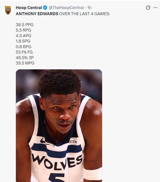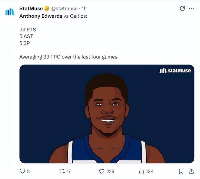 过去四场比赛,爱德华兹场均39.5分钟,拿到38.5分5.5篮板4.5助攻1.8抢断0.8盖帽,命中率53.1%,三分命中率46.5%,这个登场时间与得分说明爱德华兹打得太累了。