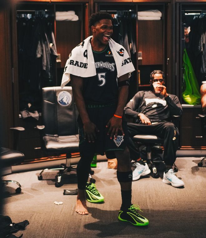 全场比赛爱德华兹37分钟,24中12,三分11中5,罚球11中10,拿到39分5助攻2篮板1盖帽0失误,命中率50%,三分命中率45.5%,真实命中率67.6%,赛后他在更衣室非常高兴。