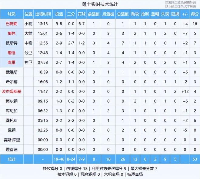 狄龙20分4板1助、吉莱斯皮7分3板4助、奥尼尔5分2板1助2断、威廉姆斯4分3板、古德温4分3板、伊戈达罗2分8板4断、布克2分1板2助、布耶2分1板1助、邓恩1助